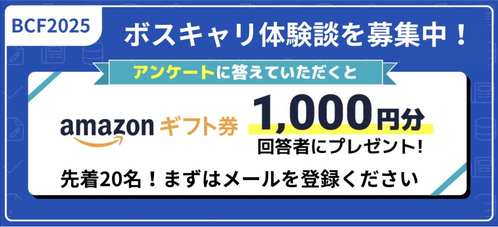 ボスキャリ終了後の体験談の投稿に協力いただける方は、以下のバナーから、ハンドルネームとメールアドレスの登録をお願いいたします。終了後のアンケート回答URLを送信させていただきます。一定の文字数以上でのアンケート回答者には、先着20名アマゾンギフトカード1000円を進呈させていただきます。