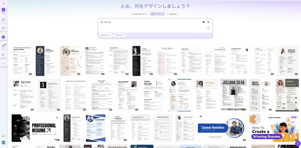 Canvaにログインして、Resumeと検索すると、非常に多くのテンプレートを見つけることができます。