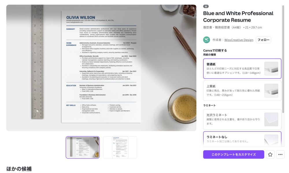 洗練されたフォーマットの作成は現在のChatGPTやGeminiなどのAIサービスでは難しいのですが、Canvaを利用すると、デザイン性に優れた英文レジュメのテンプレートを簡単に見つけることができます。