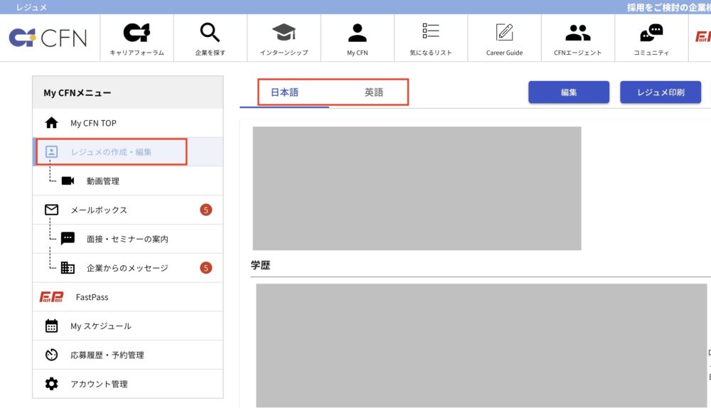 - CFNサイトの「英文レジュメ」欄に内容を入力する